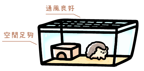 空間要足夠大,通風良好,一定要設置一個躲避的空間,向小木屋一樣,能給刺蝟更多的安全感,飼養箱地板與牆壁表面必須是實心,沒有條形或間隙,有間隙刺蝟寶寶的腳很容易卡住導致骨折,如果亂攀爬也會讓牠們摔下來。