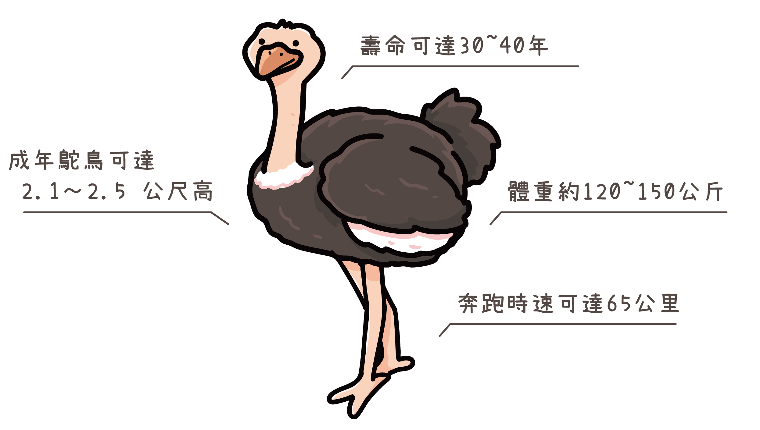 ● 成年鴕鳥可達 2.1~2.5 公尺高,光是腿就超過1公尺