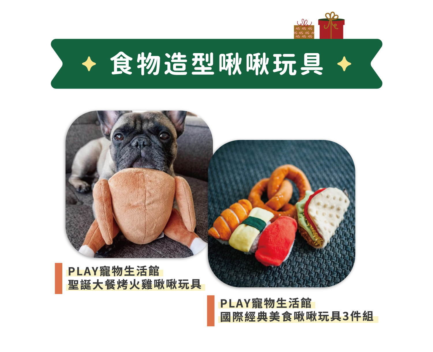 除了應景的聖誕節火雞,也有其他各種異國美食造型的發聲玩具可以任君挑選,就算家中狗狗是個挑嘴的「美食家」,也一定能找到牠喜歡的款式唷!