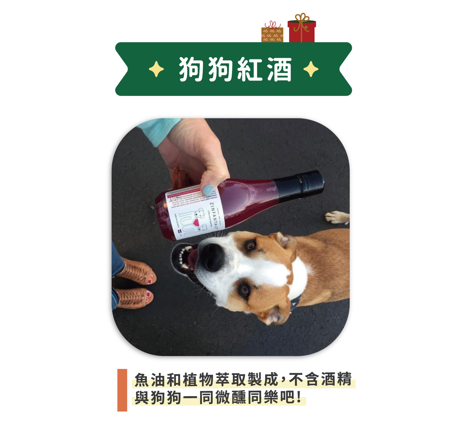 狗狗紅酒由魚油和植物萃取製成,完全不含酒精,可以讓狗狗也和你一起「乾杯」!
