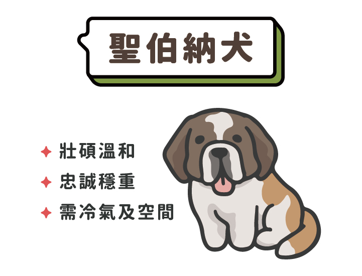 聖伯納犬溫和、忠誠、善於與小朋友互動,性格穩重,能成為很好的家庭成員,濃密的毛在炎熱的環境容易中暑,所以建議飼主要在飼養空間準備冷氣,而且牠體型龐大,要有比較寬敞的活動空間。