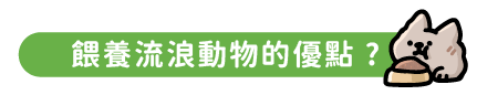 1. 讓流浪貓狗免受挨餓 : 願意餵食流浪動物的你一定是個愛寵人士,也許是自家也有養寵,才會覺得流浪在外的動物缺少關愛,非常可憐,在能力範圍內給牠們一些糧食,讓牠們飽餐一頓,你的心裡會比較舒坦,也讓流浪動物能免於挨餓的繼續活下去。