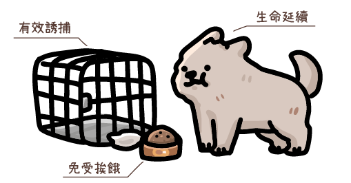 3. 有效誘捕進行TNR : 所謂的TNR就是政府目前在規廣的流浪動物政策,誘捕→絕育→放回原地,平常有在接受餵食的流浪貓狗警戒心會較低,比較容易捕捉並進行絕育,絕育後的流浪動物就不會再繁殖,增加社會負擔。
