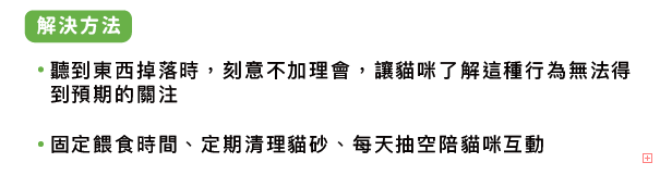 如果主人總是在貓咪弄掉東西後立刻過去關心,貓咪就會認為「東西掉了=主人關注」,開始用這種行為引起注意,原因可能是肚子餓、貓砂髒了或單純感到無聊。