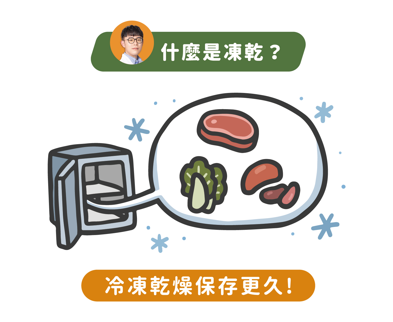 凍乾的全名叫「冷凍乾燥」。它的製作過程其實很特別,簡單來說就是把新鮮的肉類、內臟、蔬菜或其他食材先進行快速冷凍,接著利用真空環境把水分抽走。如此的處理方式能使食材營養、風味和外型都能最大程度保存下來。