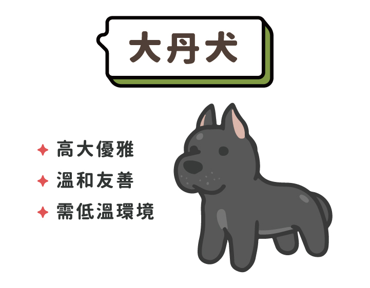儘管體型威武,但大丹犬性格溫和,對人很友善,還被稱作「溫柔巨人」,食量大、成長快速,要特別注意營養平衡與關節保護,台灣天氣炎熱,如果想養大丹犬需要有充足的降溫設備。