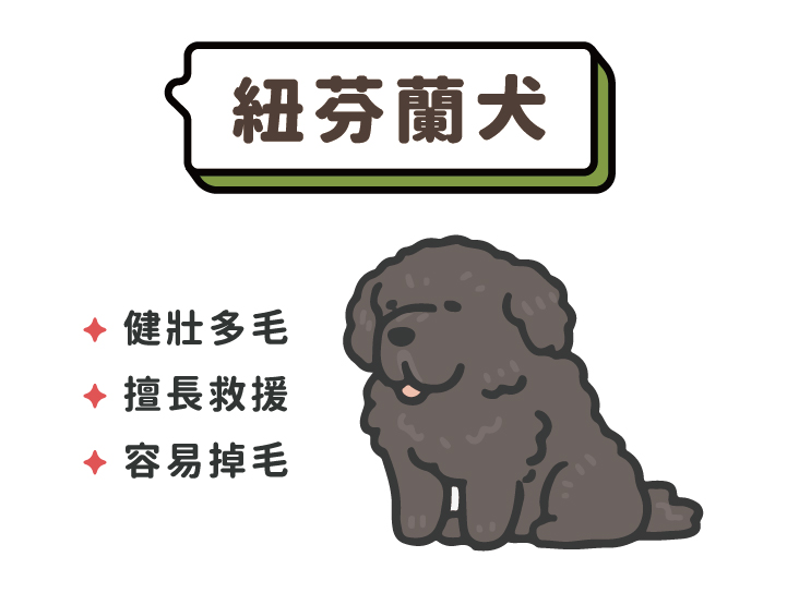 健壯厚實,毛很濃密,給人一種極具安全感的感性,紐芬蘭犬源自加拿大的島嶼,是為漁民設計的工作犬,有強大的游泳能力與救援本能,紐芬蘭犬很溫馴,並有救援的天賦,稍加訓練就能成為守護家庭的護衛隊喔!
