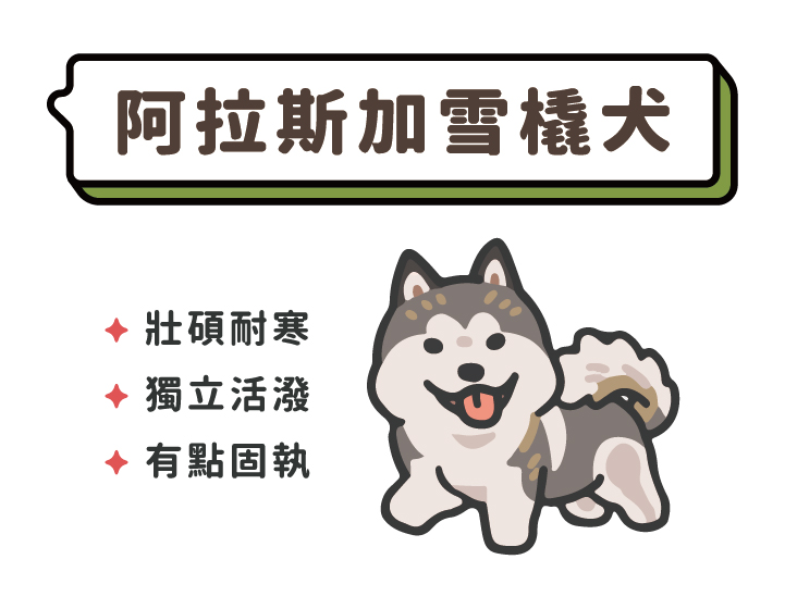 體型壯碩、有狼犬外型,雙層厚毛、耐寒力很強,起源於阿拉斯加,是當地因紐特人培育的雪橇犬,擅長拉重物與長途跋涉,聰明、獨立、有活力,雪橇犬親人但固執,不容易易訓練,比較適合有經驗的飼主來養育。